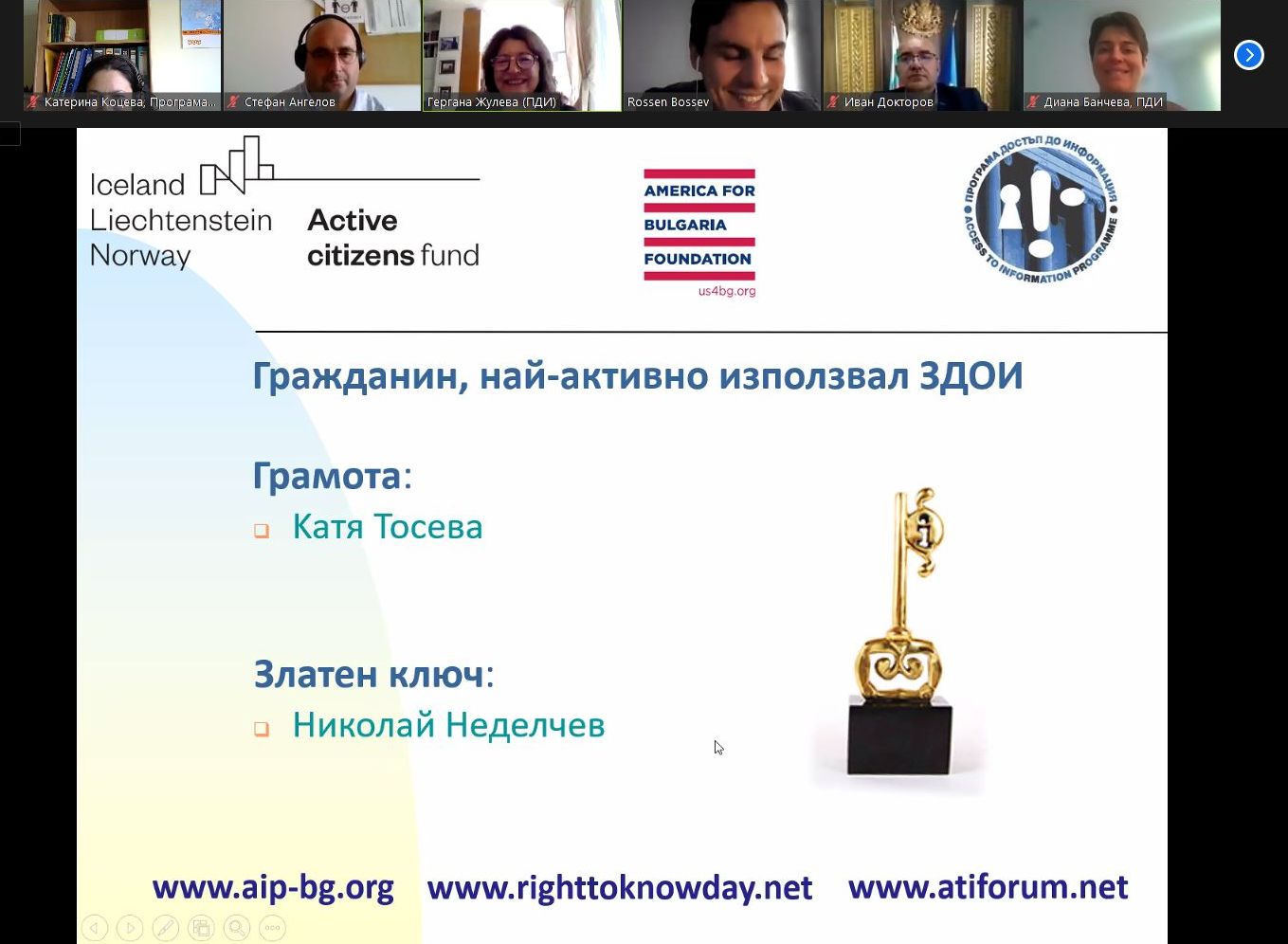 На 28 септември Програма Достъп до Информация обяви носителите на награди и антинагради по повод Международния ден на правото да знам. Церемонията бе открита и водена от д-р Гергана Жулева, изпълнителен директор на ПДИ, и се проведе онлайн, като в нея участваха близо 60 граждани, журналисти, представители на граждански организации и на държавни институции.