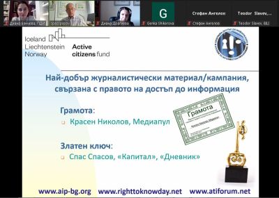 Access to Information Programme presented the annual awards to Freedom of Information Champions in Bulgaria to mark the 19th Right to Know Day – 28 September 2021. Access to Information Programme presented the annual awards to Freedom of Information Champions in Bulgaria to mark the Right to Know Day – 28 September 2021. The ceremony was held online with the participation of about 80 citizens, journalists, representatives of NGOs and public bodies. The awards were presented in six categories – 4 “Golden Keys” and two anti-awards. • Category "Citizen who has most actively used the Access to Public Information Act (APIA)" Honorary Award for lifetime contribution to the freedom of information in Bulgaria Julian Cholakov was presented with an honorary award for his lifetime efforts and use of the Access to Public Information Act to achieve enhanced openness, transparency and responsiveness of public bodies. The award, presented in memory of Cholakov, was virtually received by his son Alexander Cholakov. The “Golden Key” award went to Nikolay Nedelchev from the city of Sofia for persistent and efficient use of the APIA as an anti-corruption tool. As a result of litigation initiated by his requests, the society learned the grounds behind the termination of the inspection of the case which has become renowned as TSUM-gate (2017 informal meeting between the General Prosecutor, the publisher of one of the biggest newspapers “Sega”, and a political leader from the opposition, who owns the building of the Central City Shopping Center – TSUM). In another case, Nedelchev’s persistence led to the release of the list of court cases against the State Fund “Agriculture” sanctions imposed on beneficiaries of the EU Rural Development Program who had received funding for the development of rural guest-houses in proven conflict of interests. It turned out that the State Fund predominantly was losing those cases. The court case for access to the inspection reports of ski-zone Bansko set a precedent in the court practice in favour of the information seekers. • Category “NGO which has most actively exercised its access to information rights“ The “Golden Key” award went to The Bulgarian Helsinki Committee for active, persistent and consistent use of the Access to Public Information Act to obtain access to the official acts issued by the Chief Prosecutor in execution of their constitutional powers, as well as for the litigation against 10 refusals of the Prosecutor’s Office to provide access to information. The BHC team is also persistent in the search of information related to the police violence during the anti-government demonstrations from the summer of 2020. The honorary diploma went to The Bulgarian Institute for Legal Initiatives for their investigation on how money assigned for COVID-19 crisis management were spent, as well as the launch of the handbook “Step-by-Step: On the Trail of Money for COVID-19 Management” after successful access to information litigation. • Category "Best journalist story related to the access to information right" The “Golden Key” award went to Spas Spasov from Dnevnik online newspaper for his investigation about the deepening of the canals of the Port of Varna under the agreement concluded between the State Enterprise “Port Infrastructure” and “Transport-Construction and Reconstruction” EAD. The agreement was for over 200 mln. Euro. Spasov initiated and won three access to information court cases and covered every stage of the investigation in a series of publications. The honorary diploma went to Krassen Nikolov from the online Mediapool for casting light on a number of urgent issues in the public agenda and also bringing some of the access to information cases to court. He revealed facts about the distribution of luxurious cars among state officials; VAT evasion practices; “golden passports” and obtaining citizenship on merits; inefficiency of the current prosecution high officials and budget increase of a number of institutions within the judiciary. • Сategory "Institution which has most efficiently organized the provision of public information" The “Golden Key” award went to Executive Forests Agency for explicit intention towards enhanced transparency and accountability by the preparation of a public register of the hunting permits, the initiation of the proactive publication online of contracts, permits and inspection reports. The institution also works closely with the civil sector and launched the application Protect the Forest with the purpose to protect the forests biodiversity and animals in Bulgaria by allowing reports on illegal activities. The honorary diploma went to Municipality of Beloslav for their consistent transparency and accountability policies. In 2021, the municipality holds the 4th place in the Active Transparency Rating of all 563 public bodies and is on 3rd place among the 265 municipalities in Bulgaria. It is among the municipalities which responded within 5 days to the access to information request submitted within the annual AIP survey. • Category "Institution which does not fulfill its obligations under the APIA and violates citizens’ rights under the APIA" The “Padlock” anti-award went to The Prosecutors’ Office of Bulgaria for their closure towards the society by systematic refusals to provide information under the Access to Public Information Act, by selective release of information when often some facts remain concealed even for investigative journalists and despite the overriding public interest. • Category “Most absurd and funniest administrative decision related to an access to information request” The “Tied Key” anti-award went to The State Fund “Agriculture” for the absurd practices of issuing a refusal to information which has been published online, instead of referring the requestor to the place of publication. * * * The 2021 Right to Know Day c
