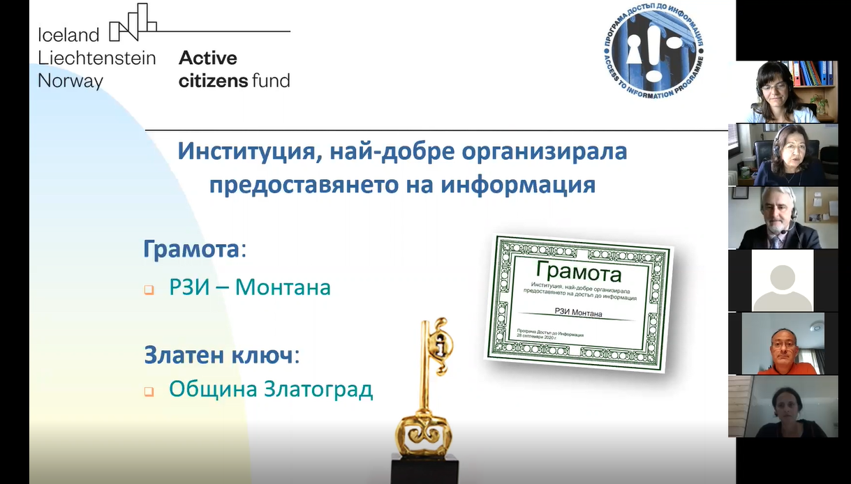 In the category "Institution which has most efficiently organized the provision of public information" the “Golden Key” award was handed to Zlatograd Municipality for their detailed monthly reports on the spending of budget funds as a sustainable practice since 2012.
