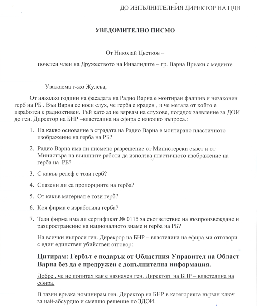 Приключението със заявление е описано в статията на Здравка Маслянкова „НЗОК - изгубена в превода“, месечен информационен бюлетин на ПДИ, брой 8(140), август 2015. Областна дирекция на МВР - Перник Номиниращ: Дарина Палова, ПДИ Във връзка с ежегодното проучване на Програма достъп до информация на интернет страниците на институциите в България, участващите в проучването подаваме и заявление по e-mail с цел да проследим практиките по отговори на електронни запитвания по ЗДОИ. В тази връзка подадох заявление до директора на Областна Дирекция на МВР - Перник, с което поисках да ми предоставят: 1. Копие от заповедта за определяне на служител по ЗДОИ в дирекцията и 2. Копие от длъжностната характеристика за заеманата от определения служител длъжност. В отговор получих решение, в което се посочва, че ще ми предоставят частичен достъп, тъй като исканата информация съдържала лични данни: "Изхождайки от законовите разпоредби считам, че исканата от заявителката информация има характера на обществена информация, налице и се съхранява в ОДМВР- Перник, поради което няма законова пречка същата да бъде предоставена по реда на Закона за достъп до обществена информация (ЗДОИ). С оглед обстоятелството, че документите достъп до които се иска съдържат информация, която попада в обхвата на определението "лични данни", съгласно §1, т.2 от ПЗР на ЗДОИ, исканата информация следва да бъде предоставена частично по смисъла на чл.7, ал.2 от ЗДОИ, след заличаването на информацията, отнасяща се до третото лице." В резултат на това решение действително получих копие от заповедта за определяне на служител по ЗДОИ в дирекцията и дори две заповеди /на служител, който приема устните запитвания и служител, който да предоставя информация в останалите случаи/, но проблемът е, че имената им са заличени и всъщност отново не знам към кого трябва да се обърна, за да поискам информация. Министерство на околната среда и водите (МОСВ) Номиниращ: Кирил Терзийски, ПДИ В рубриката абсурди на инат: Втора поредна година Министерство на околната среда и водите (МОСВ) заема позиция, че по реда на Закона за достъп до обществена информация (ЗДОИ) може да се иска информация, но не и достъп до конкретни документи. В съответствие с тази позиция, министерство и подчинените му структури редовно отказват да предоставят конкретни документи. В случаите, когато министерството реши да предостави достъп, това става чрез преразказване на документите в писмени справки, за които понякога се искат баснословни суми. Опитите на две неправителствени организации да убедят министерството, че подобна позиция и практика по ЗДОИ не само е незаконосъобразна, но и противоречи на трайната съдебна практика, удрят на камък.