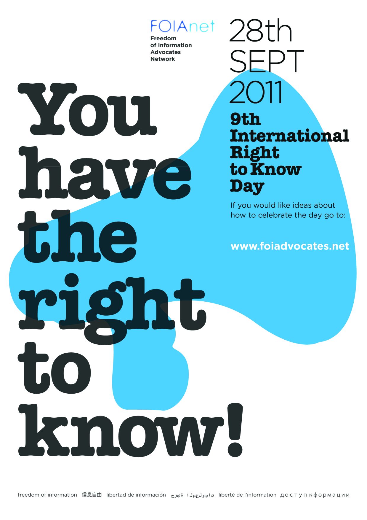 През лятото на 2011 Международната мрежа на застъпниците за свобода на информацията (FOIAnet) подготви специален плакат за 28 септември - Деня на правото да знам на английски, френски и испански език, който използваха в своите кампании. Появи се и триминутно видео, компилация от изказвания на организации и активисти от цял свят за значението на правото да знам също по идея на Международната мрежа. Програма Достъп до Информация даде своя принос за изготвянето на видеото. То бе излъчено на церемонии, пресконференции и дискусии, организирани от членовете на Мрежата. |