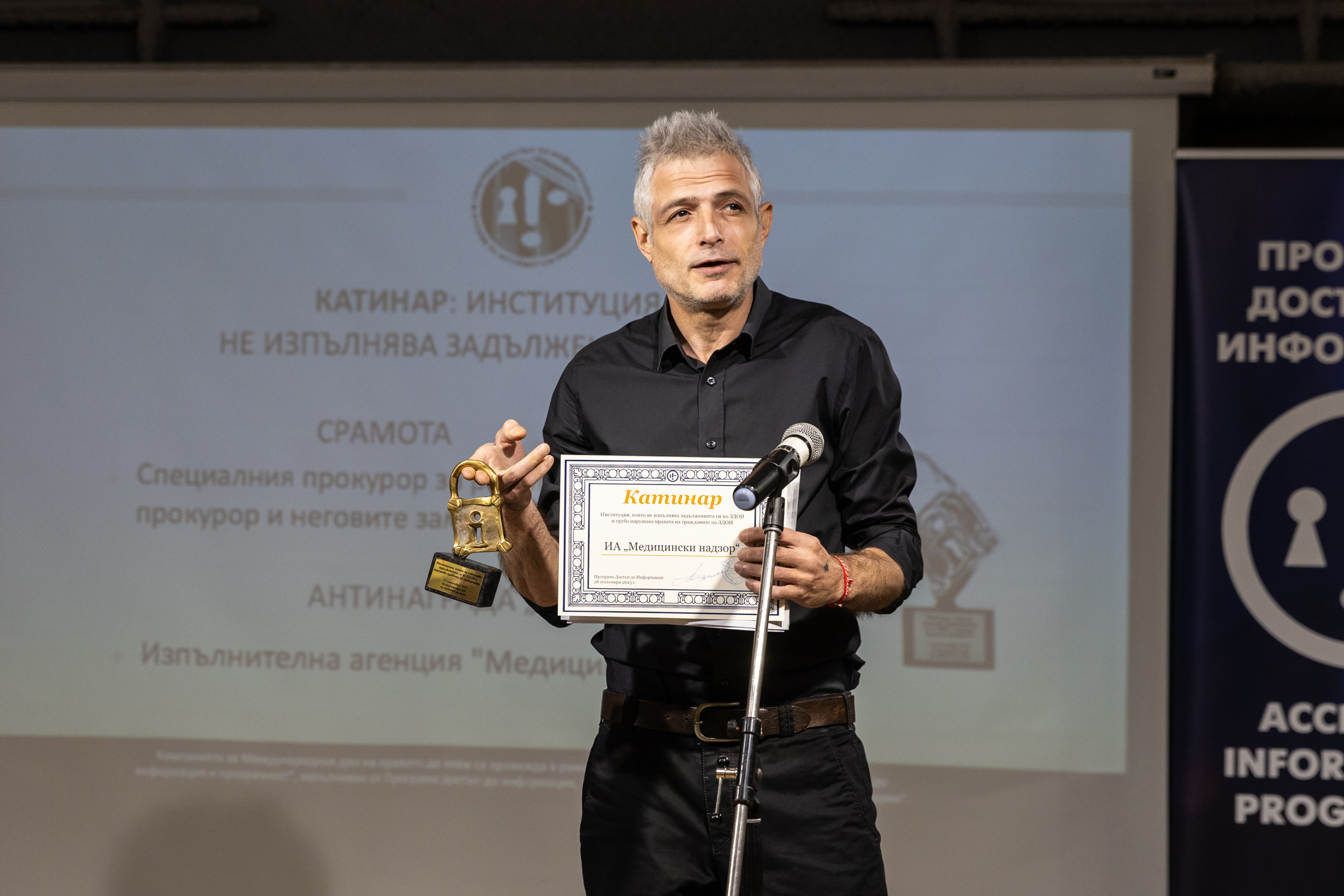 Изпълнителна агенция "Медицински надзор" за откази на достъп до информация по заявления на журналисти, свързани с проектите по Националната програма за насърчаване на донорството и подпомагане на трансплантацията 2024-2028 г. Вместо да подобри дейността си и да се съобрази с богатата съдебна практика, че защитата на трети лица не може да бъде алиби за пълен отказ да се предостави информация за разходването на публични средства по програмата (вкл. по дела, водени срещу самата агенция), тя продължава да отказва, прикривайки се зад волята на трети лица. Подобна практика в сферата на здравеопазването е изключително вредна, доколкото това е единственият централен контролен орган със специализирана компетентност – да контролира качеството на оказваната медицинска помощ и да организира осъществяването на дейностите по трансплантация на органи, тъкани и клетки, и упоритият отказ да работи прозрачно и в услуга на гражданите е в разрез с ефективната защита на техните здравни права.